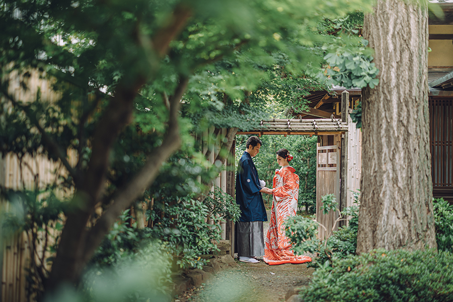 紅白の番傘が華やかで広いお庭のなかでも写真にアクセントをプラスしてくれます!