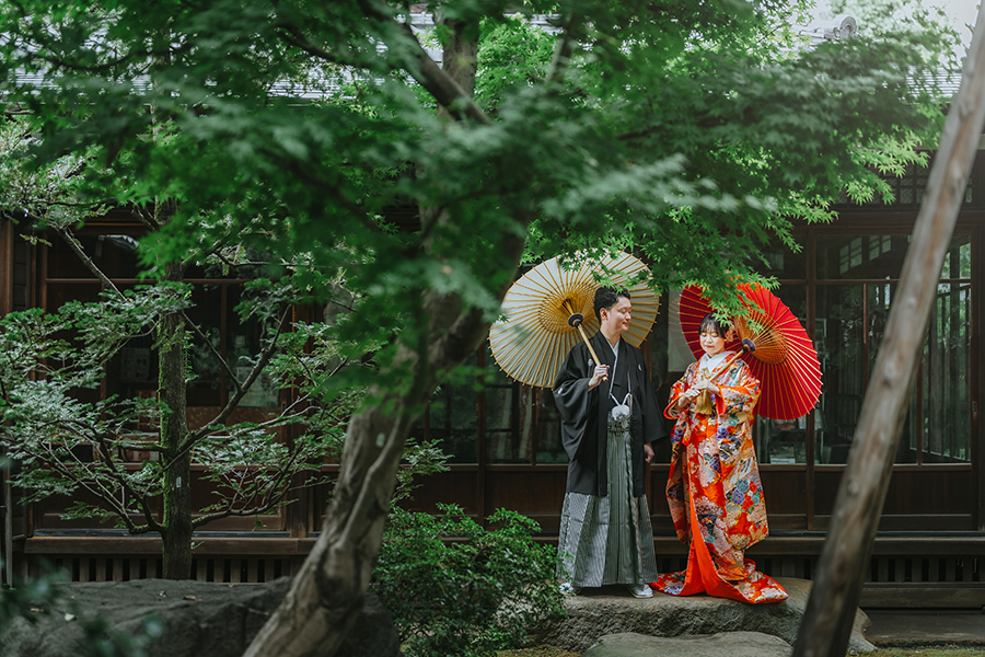 紅白の番傘が華やかで広いお庭のなかでも写真にアクセントをプラスしてくれます!