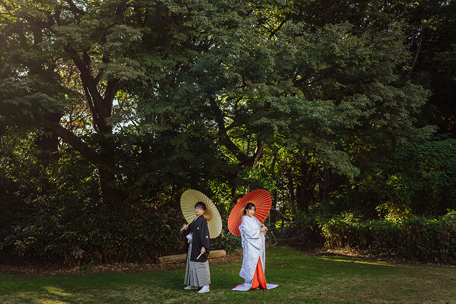 紅白の番傘が華やかで広いお庭のなかでも写真にアクセントをプラスしてくれます!