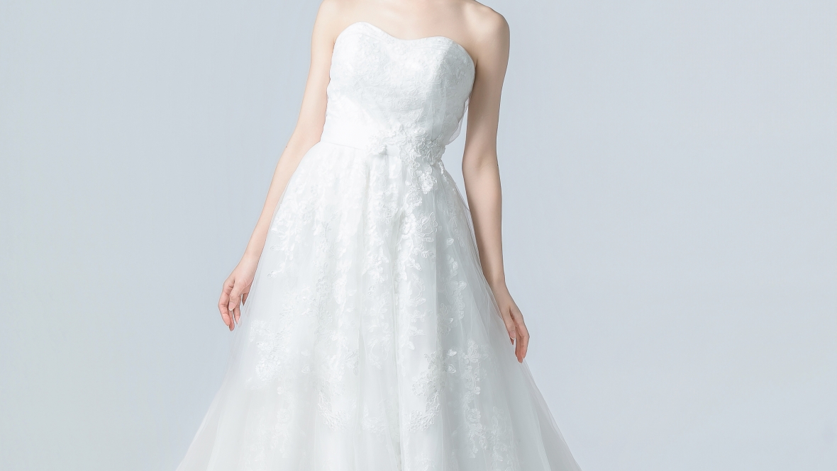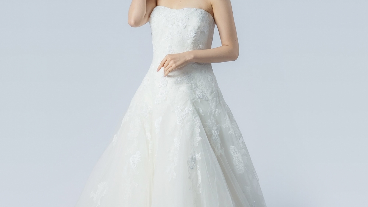 シンプルで上品な王道Aライン。花嫁らしい愛らしさも残しつつ甘くなりすぎないスタイルが魅力。