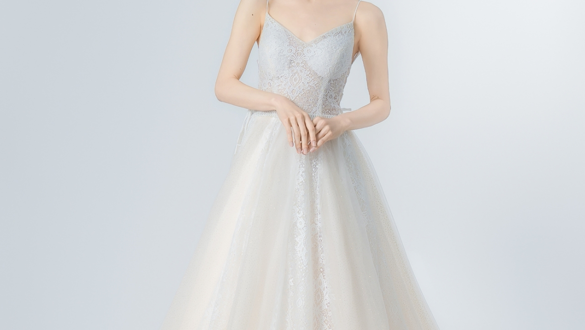 オフショルダーのチュールが上品で美しいドレスで、二の腕部分もさり気なくカバーしてくれる1着。